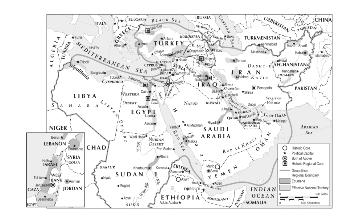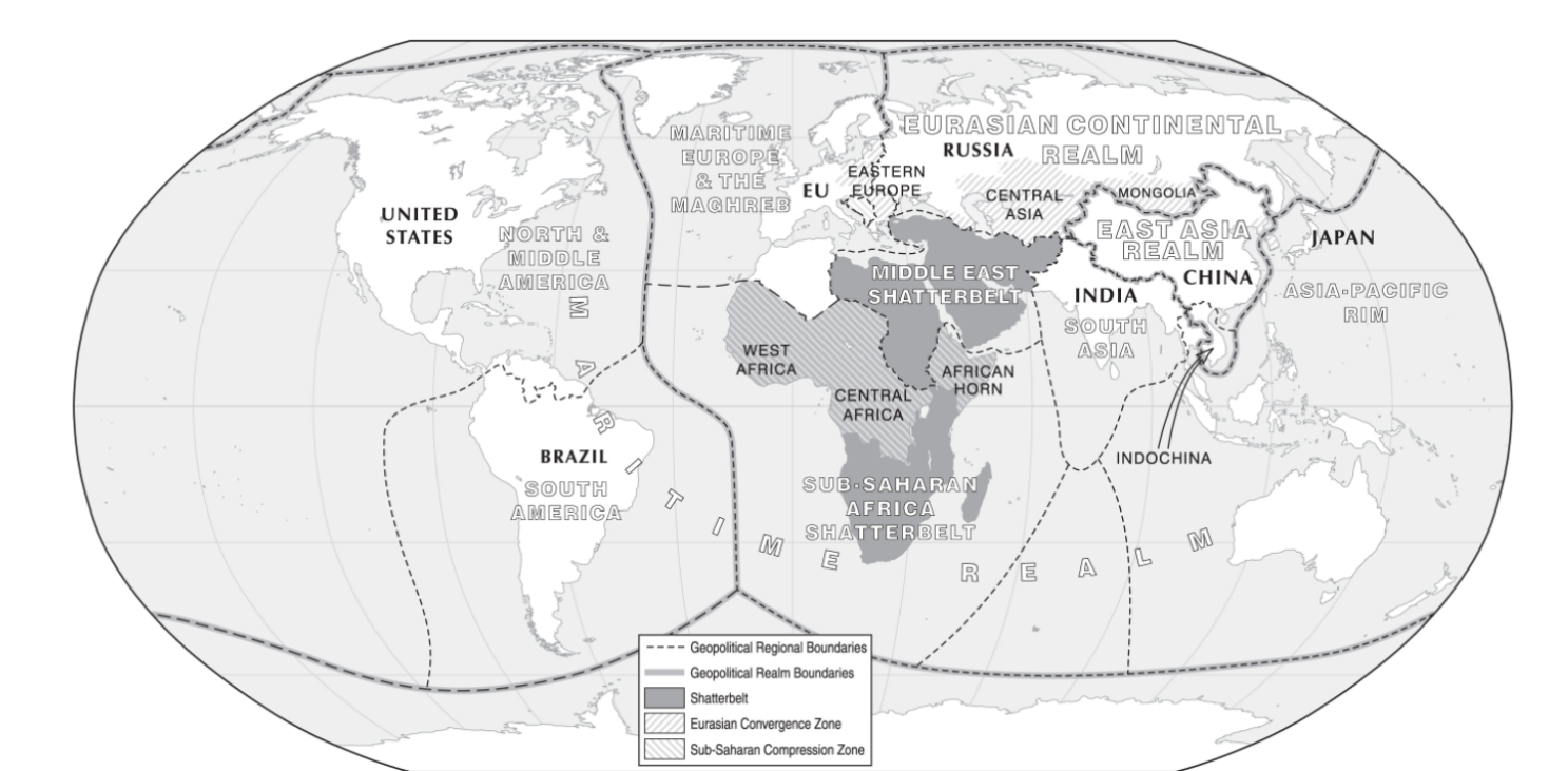 Cohen also developed the concept of Geopolitical structure, which divides the world into four distinct sectors based on shared characteristics. First sector, the Geostrategic Realms, comprises areas that enhance the projected power of major states and offer strategic advantages such as sea passageways. These realms can be divided into sea-based and land-based categories. There are three realms: the Atlantic-Pacific, the Eurasian Continental (Russian heartland) and the mixed continental-maritime East Asia. Second sector, the Geopolitical Regions, consists of subdivisions of realms, and some are located between or far away from them. Moreover, they shares many characteristics such as political interactions, and they are tactical nature, focusing on neighborhood-level interactions. The regions include: North and Middle America, South America, maritime Europe and the Maghreb, the Asia-Pacific Rim, the Heartlandic Russian, Central Asia, Trans-Caucasus, Mainland China and Indochina and South Asia. Third sector, the Shatterbelts, consist of deeply fragmented regions marked by persistent internal and external divisions where great-power competition constantly occur over control of resources and strategic locations. These conflicts often spread to neighboring states, causing regional or even global instability. The are two main shatterbelts: the Middle East and Sub-Saharan Africa. Finally, fourth sector, the Gateway States, includes countries that act as ‘bridges’ of the world, facilitating the flow of people, goods and ideas. They possess strategic location, specialized economies, and diverse cultural and political systems and an adaptable population; however, gateway states lack self-sufficiency and depend mostly on imports.